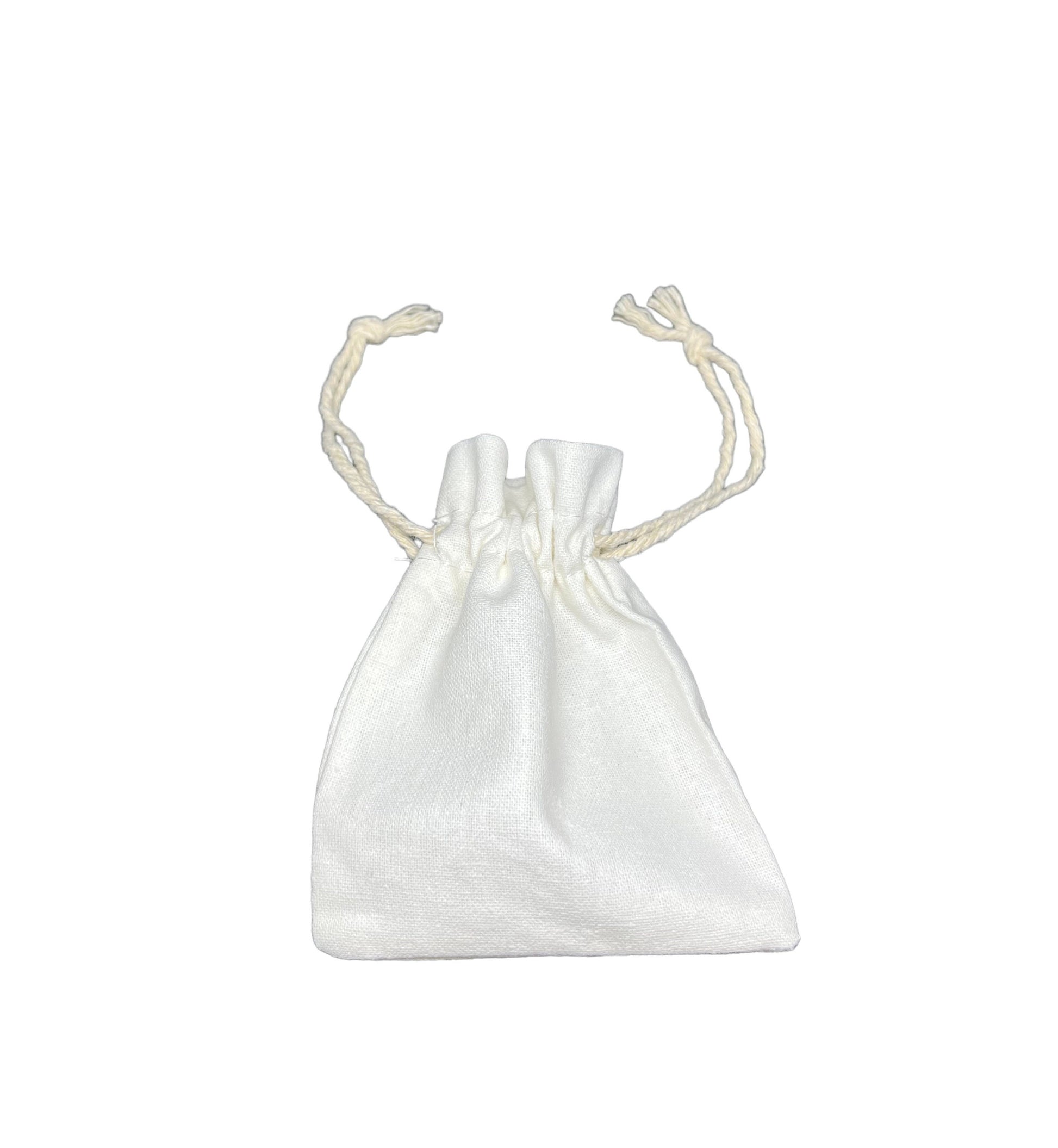 Off White 100% cotton drawstring bag with natural string pull drawstring.