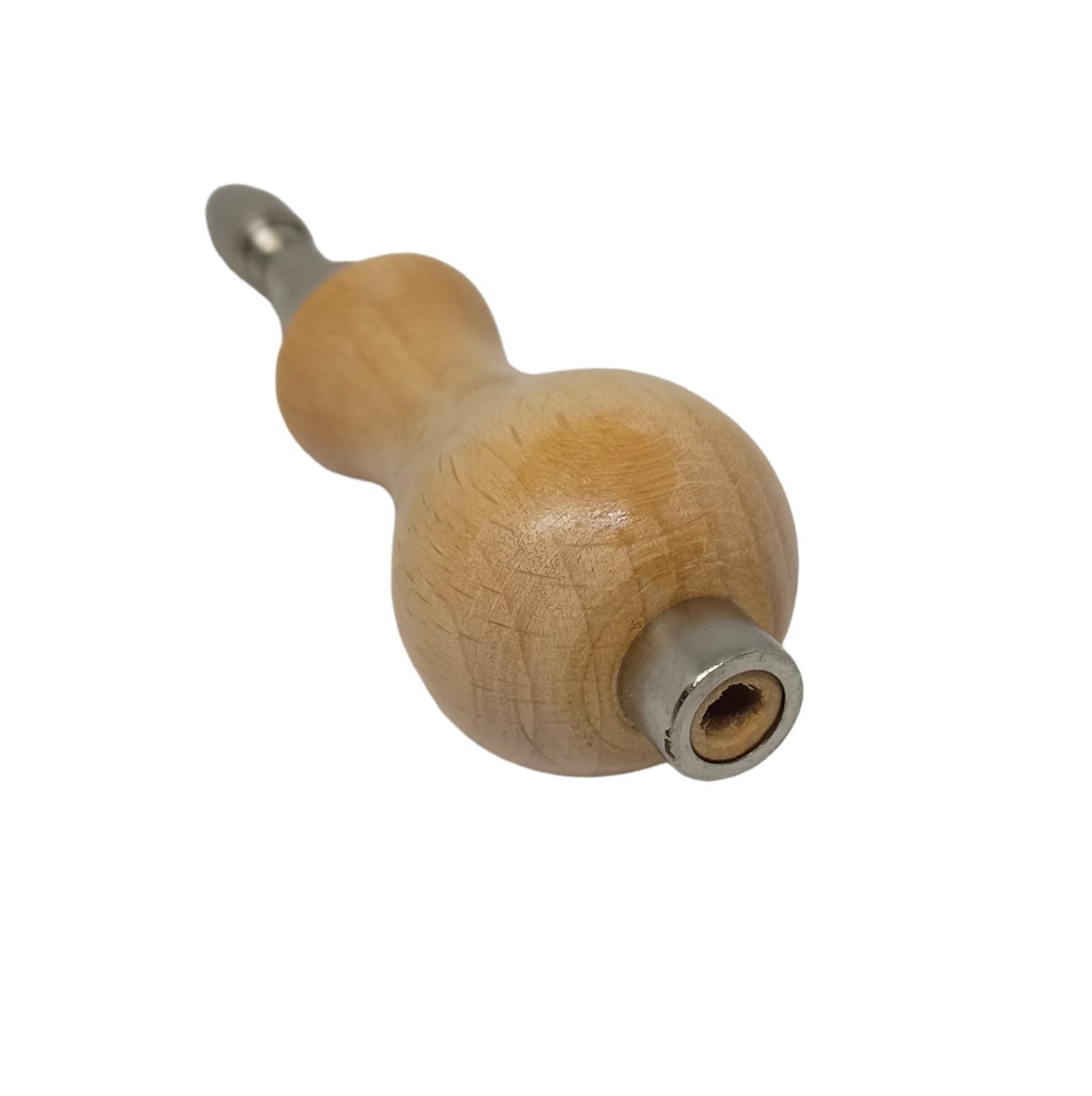 This handle comes with a chuck, with the end of wooden handle bored and reinforced. It can be attached to tapered spindles so that small burs, buffs and rotary tools can be used on larger polishing motors.