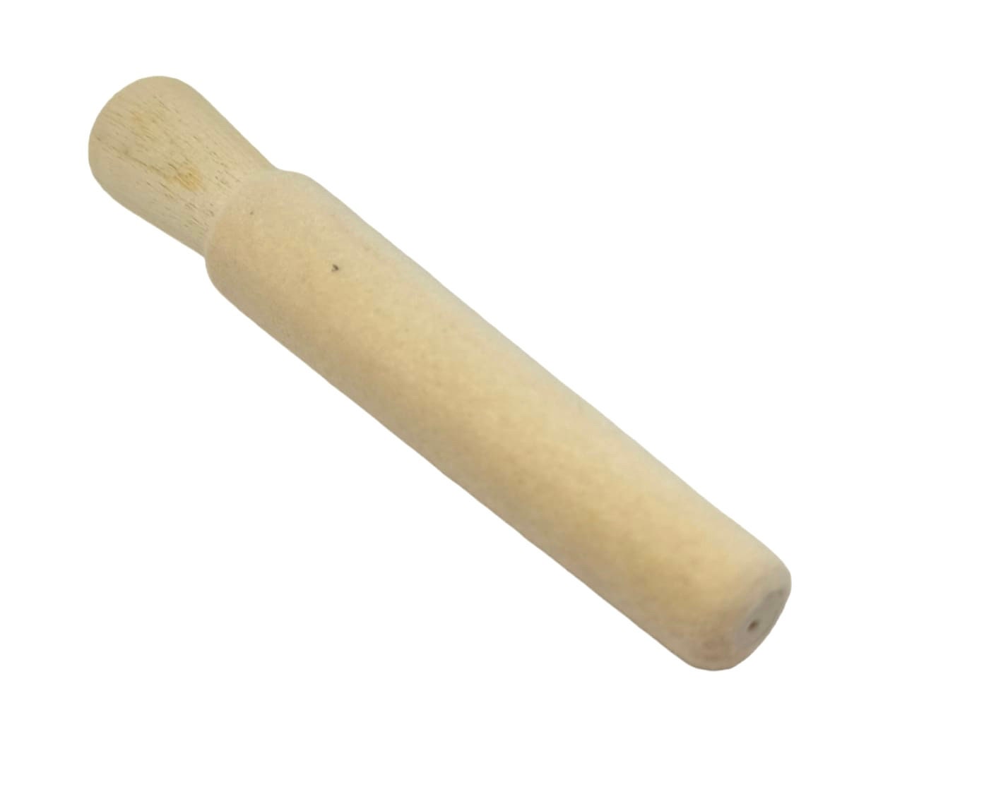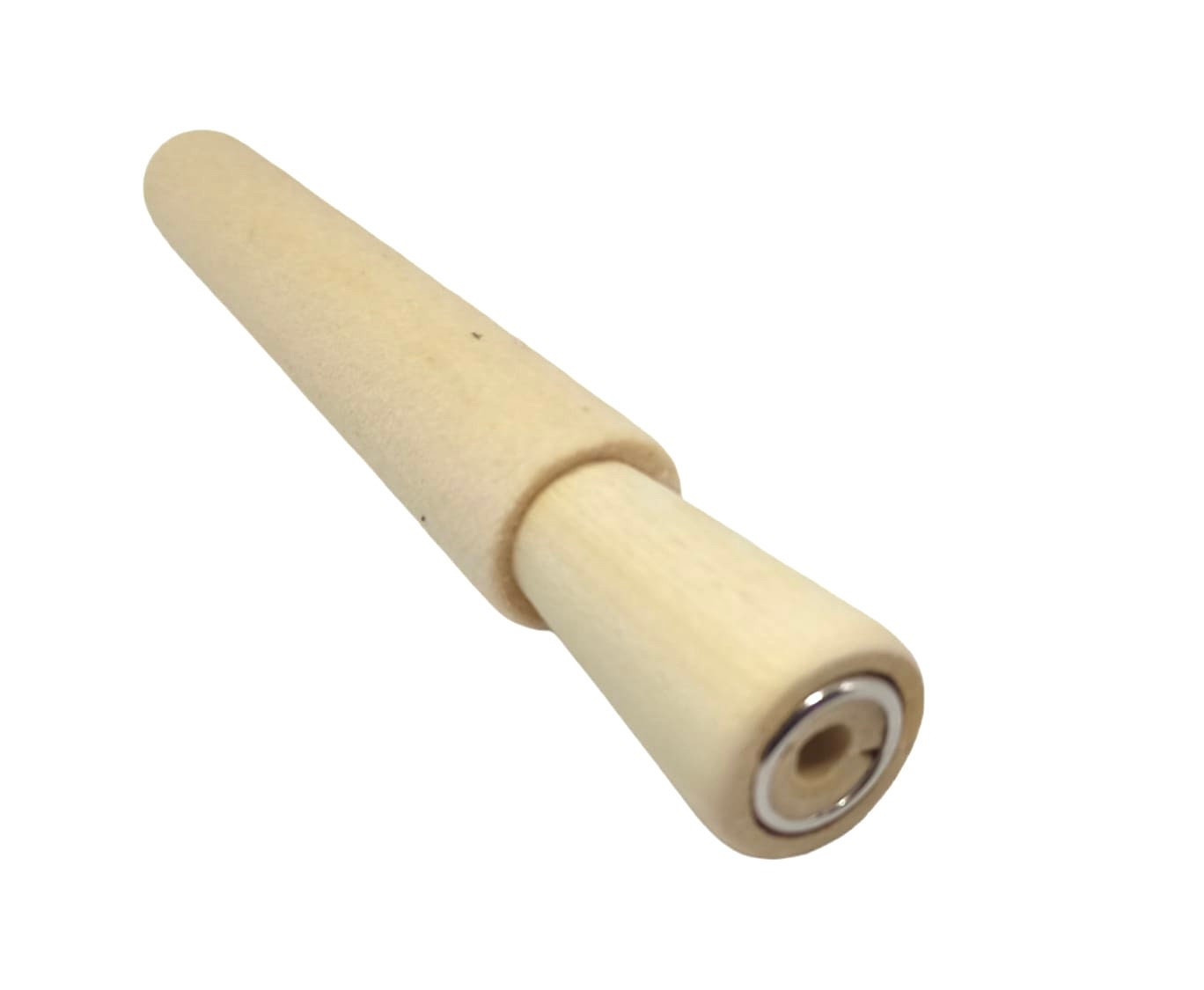 A compressed layer of wool felt is well-mounted on this tapered, hardwood mandrel.