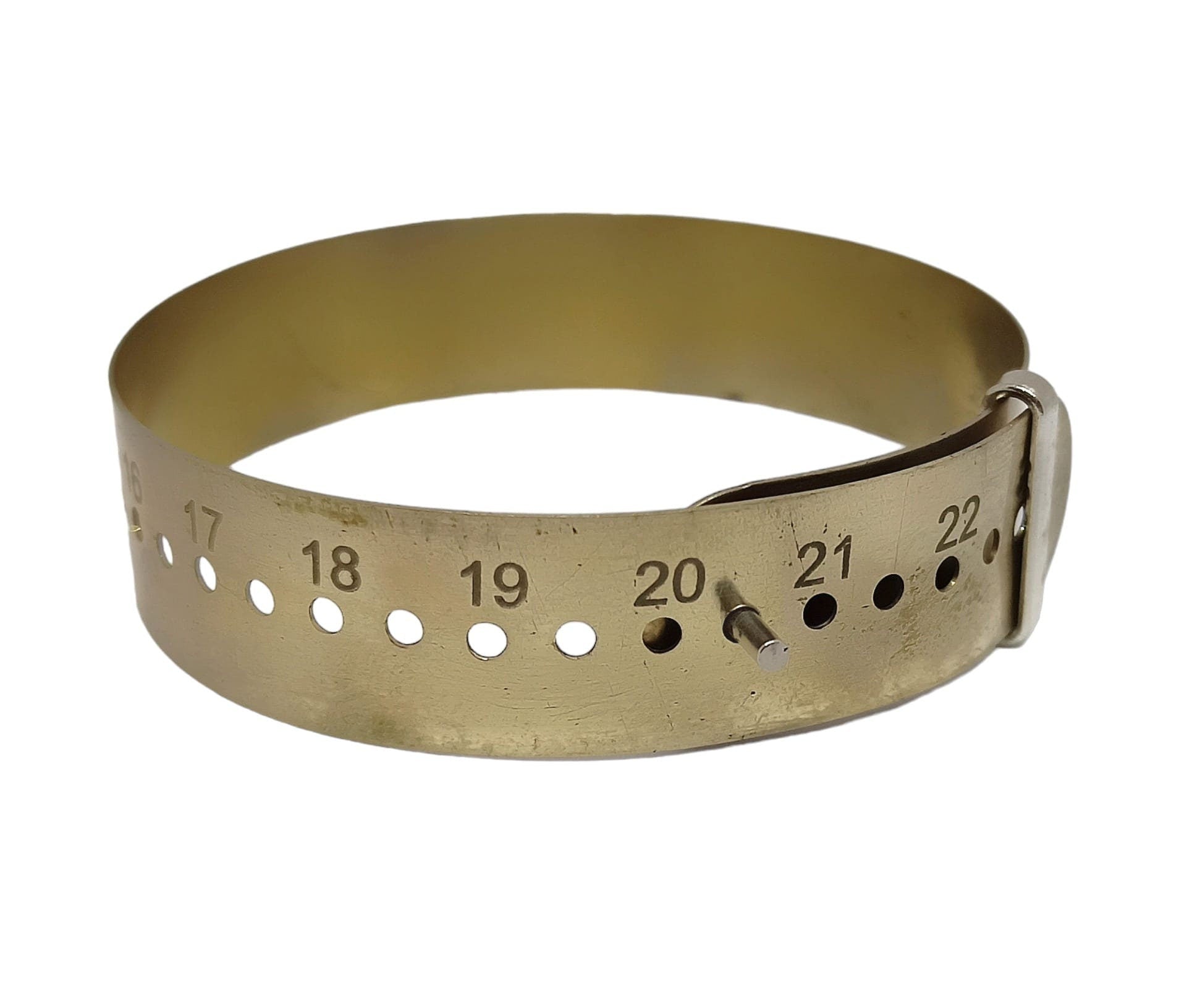 Adjustable band with sizes clearly marked in Centimetres. Adjust to desired size then slide clasp to close and determine the fit on the persons hand.