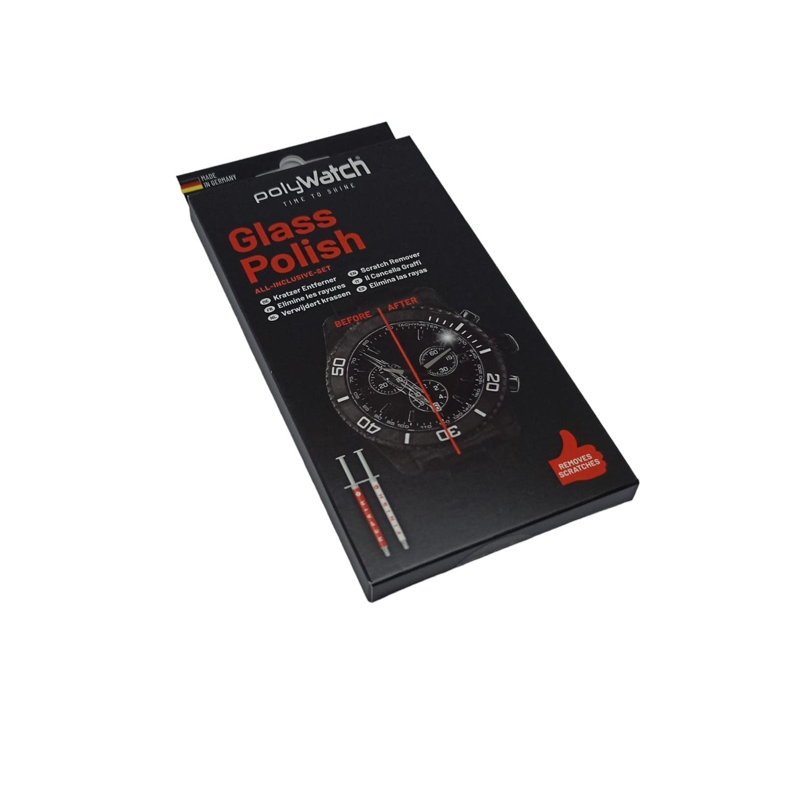 Polywatch® Glass Polish. High Tech Scratch Remover For Glass. Repair rather than replacing. Removes fine, light and medium deep scratches from watch glasses. Sufficient for approx. 30-40 applications. For use on cars, smartphones, watches, furniture, household, hobby, windows etc.